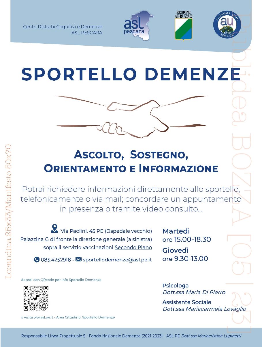 Perseguendo le finalità di supporto psico-educazionale e psico-sociale dell’”Area Progettuale 5” del Fondo Nazionale Demenze (2024-2026), proposto dal Ministero della Salute, si è proceduto alla attivazione di uno Sportello presso il Centro Disturbi Cognitivi e Demenze (CDCD) del Presidio Ospedaliero della ASL di Pescara, con finalità di ascolto, sostegno, orientamento e informazione, dedicato ai caregiver dei pazienti con demenza.